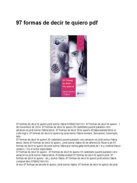Read Online 97 formas de decir " te quiero " 33 castellano juvenil paralelo cero PDF online is a convenient and frugal way to read 97 formas de decir " te quiero " 33 castellano juvenil paralelo cero you love right from the comfort of your own home. Yes, there sites where you can get PDF "for free" but the ones listed below are clean from viruses and completely legal to use.